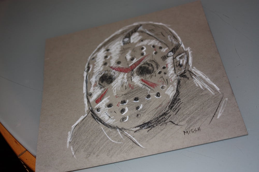Here's my addition to this year's Friday the 13th! This is greytone paper with prismacolor pencil, red ballpoint pen, and charcoal white. This is about 6x6 inches and DOES NOT COME FRAMED.