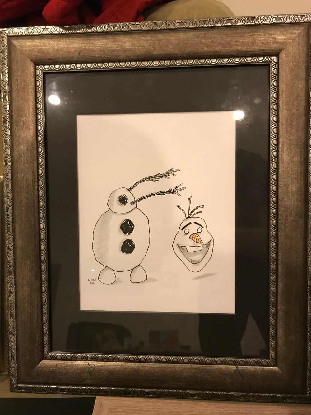 My take on the lovable snowman, Olaf. This is done with micron ink and prismacolor pencils. It’s on a 9x12 heavy white stock paper—and put in a vintage faux metal 16x20 frame with a black matt.